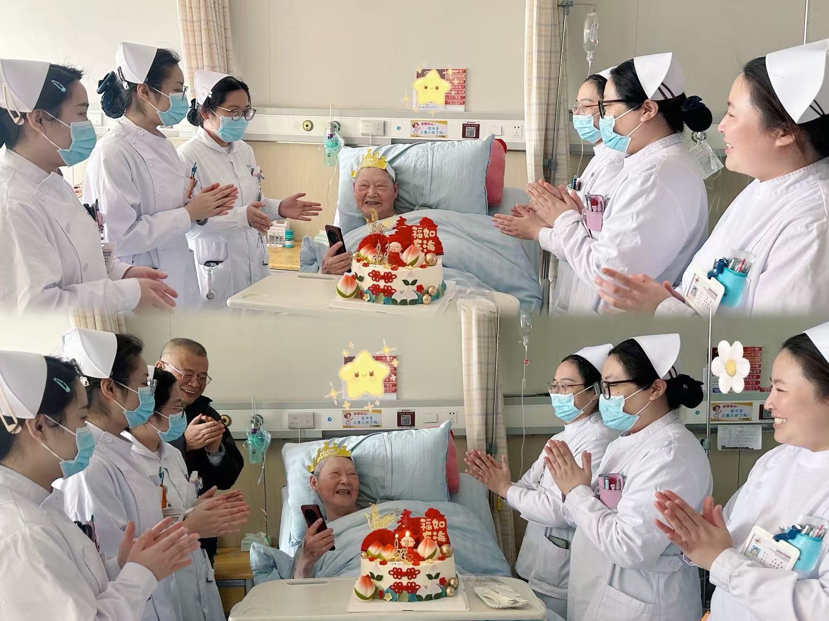 无独有偶,10月24日中午,内五病区护理团队来到一位94岁高龄患者的床前,送上生日蛋糕与祝福。在温馨的歌声里,在一声声关切的问候中,大家见证了感动与笑容。病床前这特殊的生日祝福深刻诠释了:医学可以治愈疾病,而爱与关怀能温暖心灵。